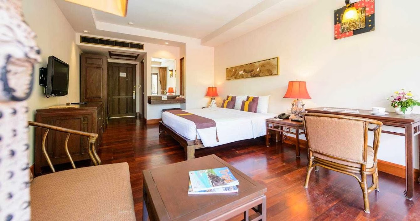 חדרים מאווררים עם הדגשים אסייתיים באתר נופש עם ארוחת בוקר חינם, בריכה חיצונית ובר לצד הבריכה.