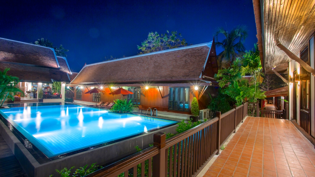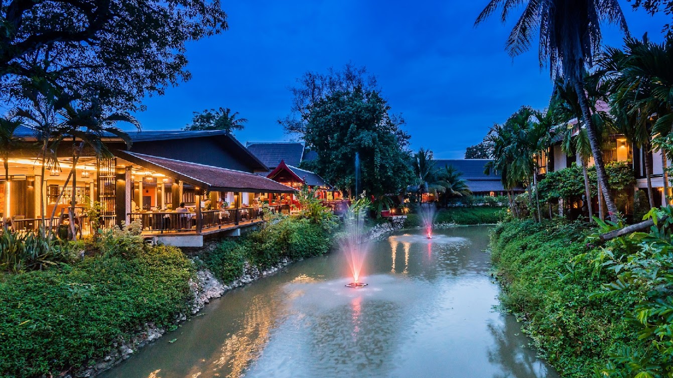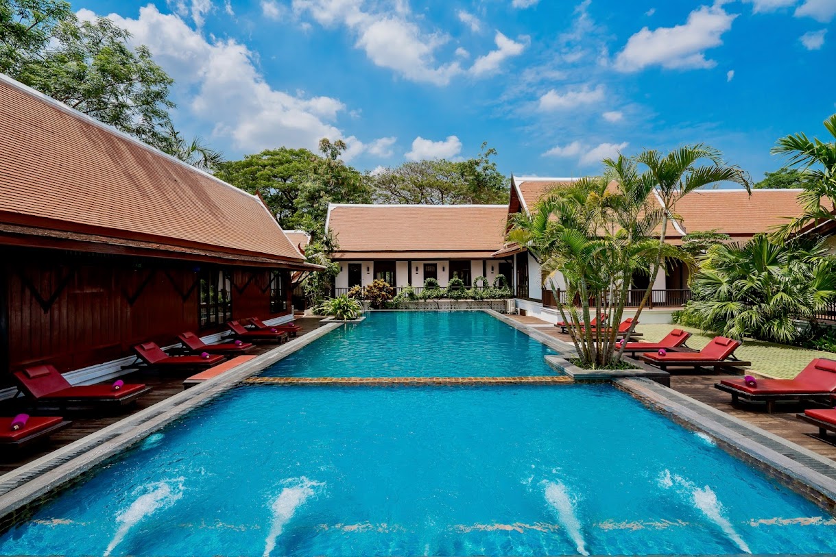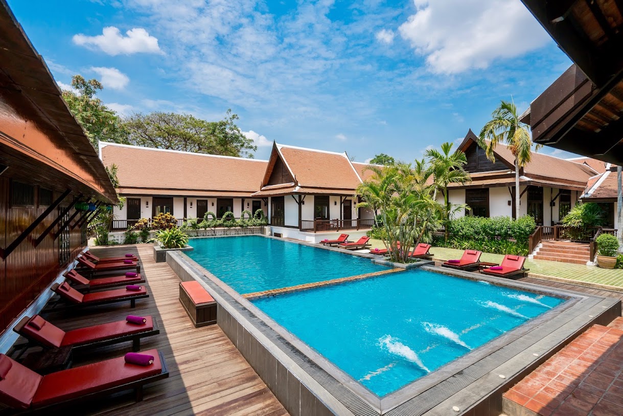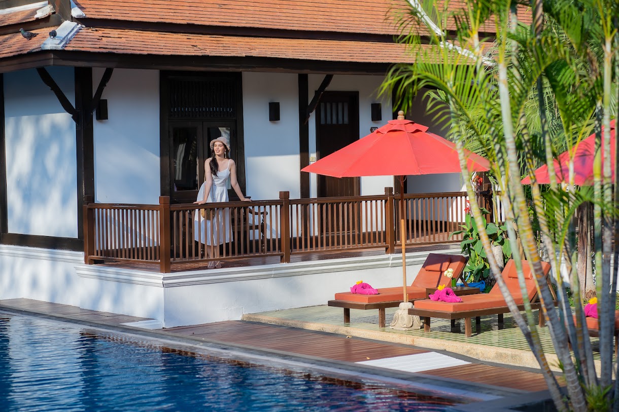 אתר נופש מעודן עם חצר ואוכל באוויר הפתוח, המציע חדרים מלוטשים ובריכת מים מלוחים.