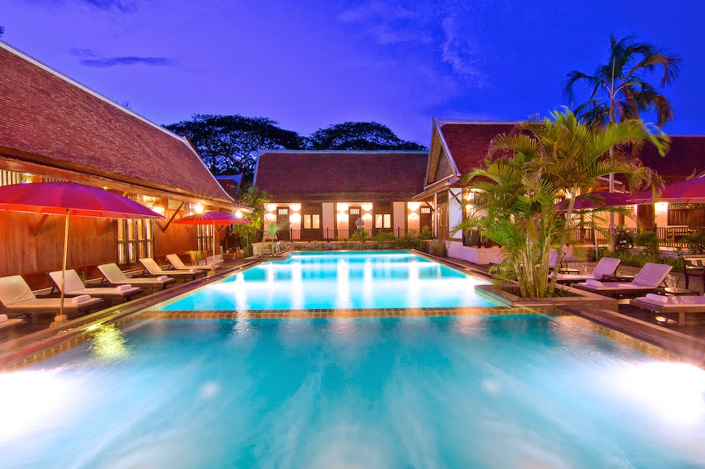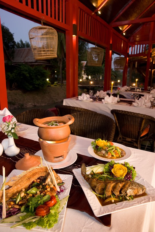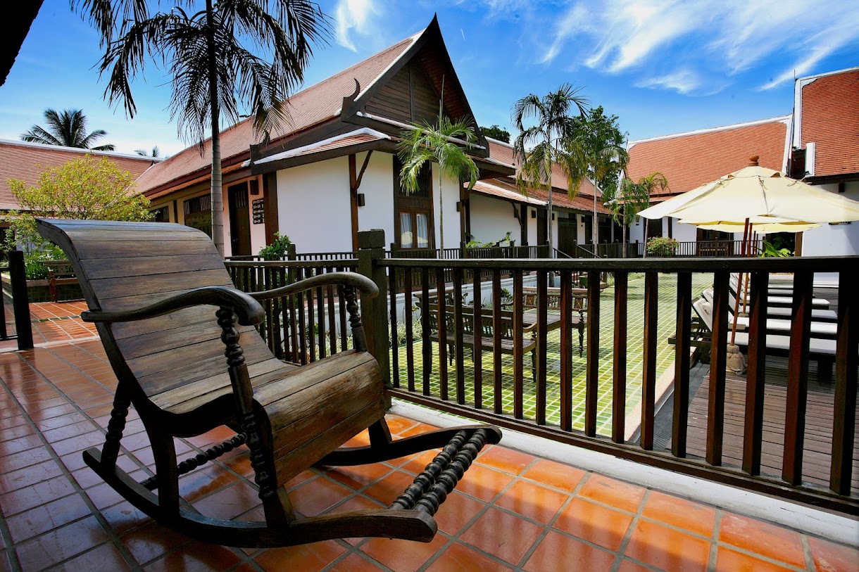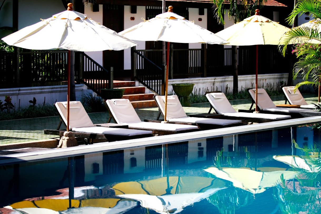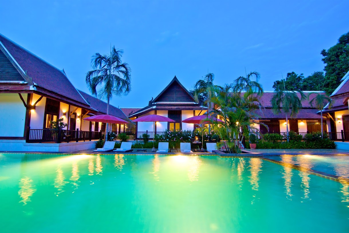 אתר נופש מעודן עם חצר ואוכל באוויר הפתוח, המציע חדרים מלוטשים ובריכת מים מלוחים.