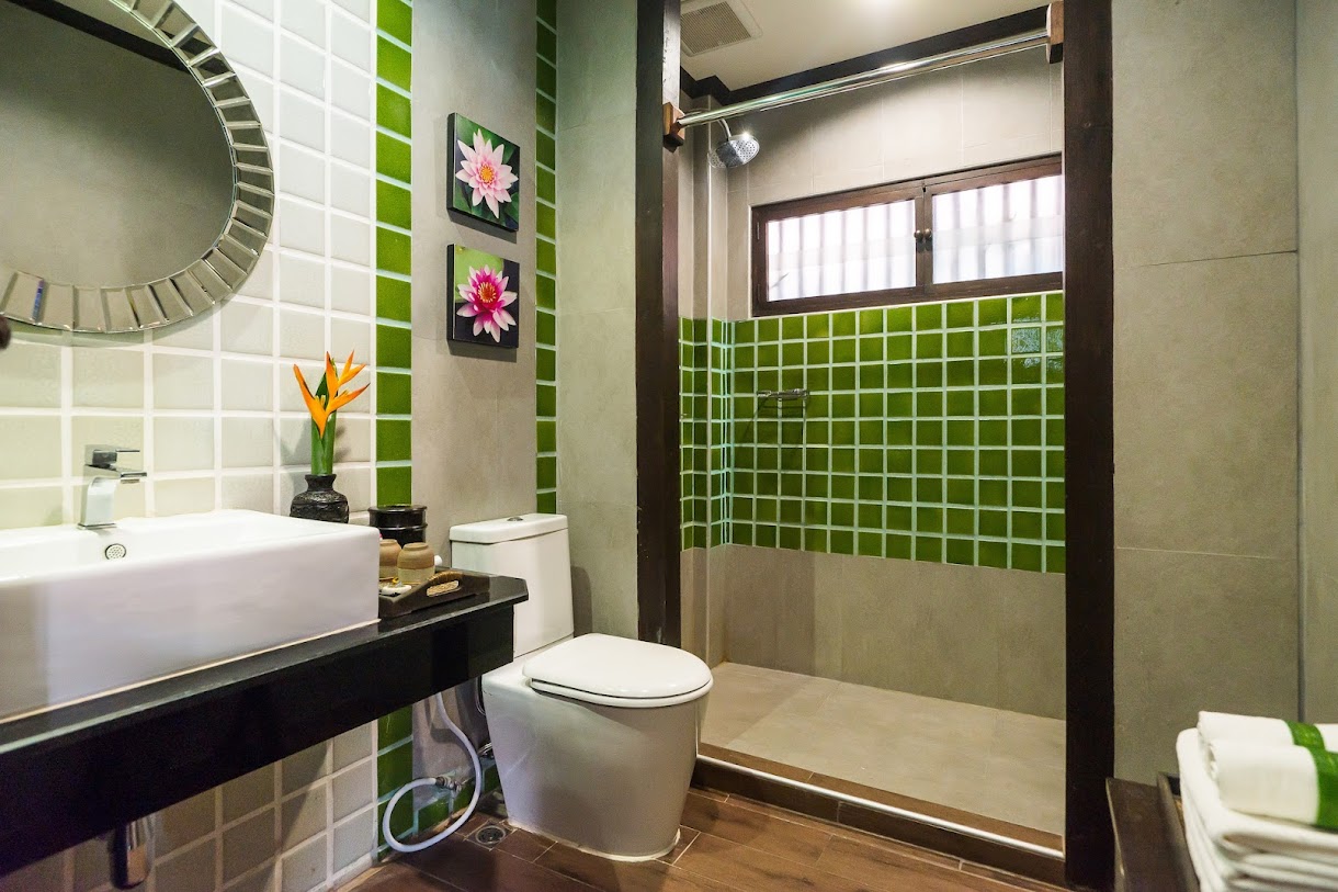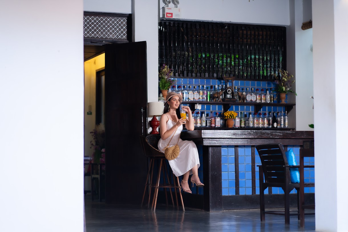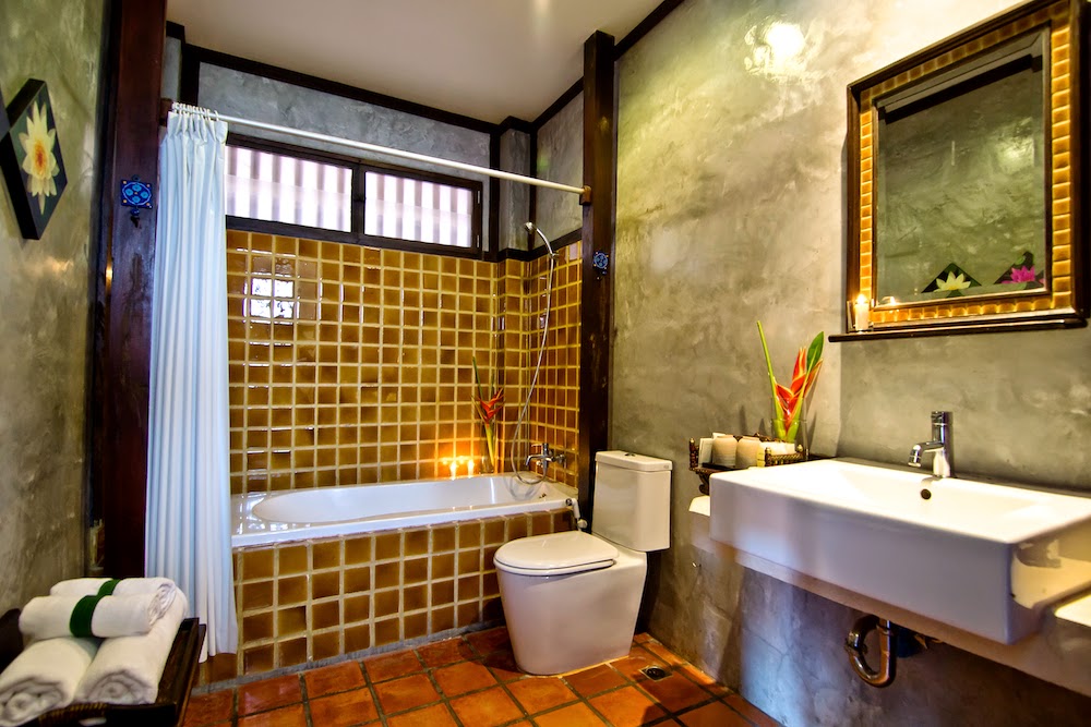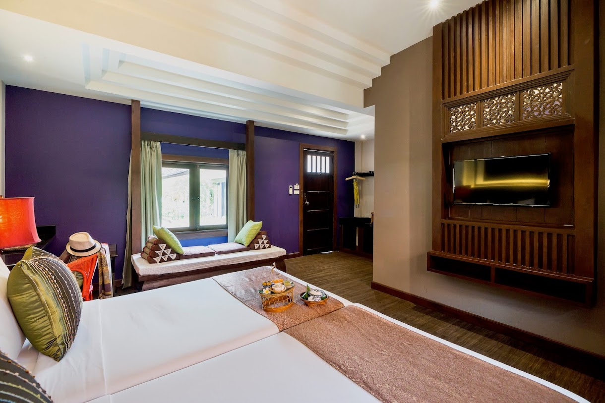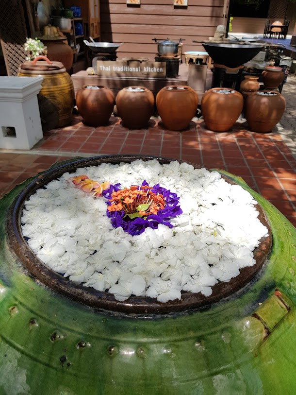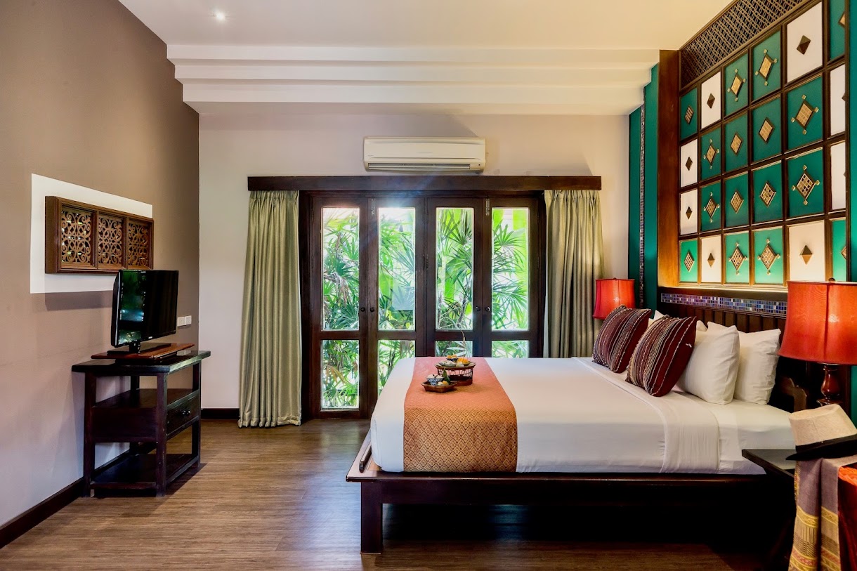 אתר נופש מעודן עם חצר ואוכל באוויר הפתוח, המציע חדרים מלוטשים ובריכת מים מלוחים.
