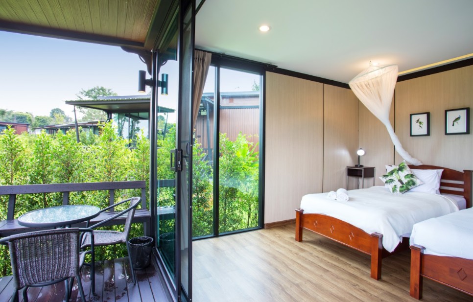 וילות מוארות עם טרסות במלון הררי שליו המציע מסעדה ובריכה חיצונית.