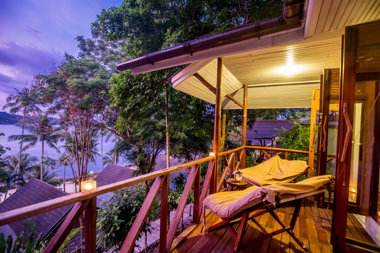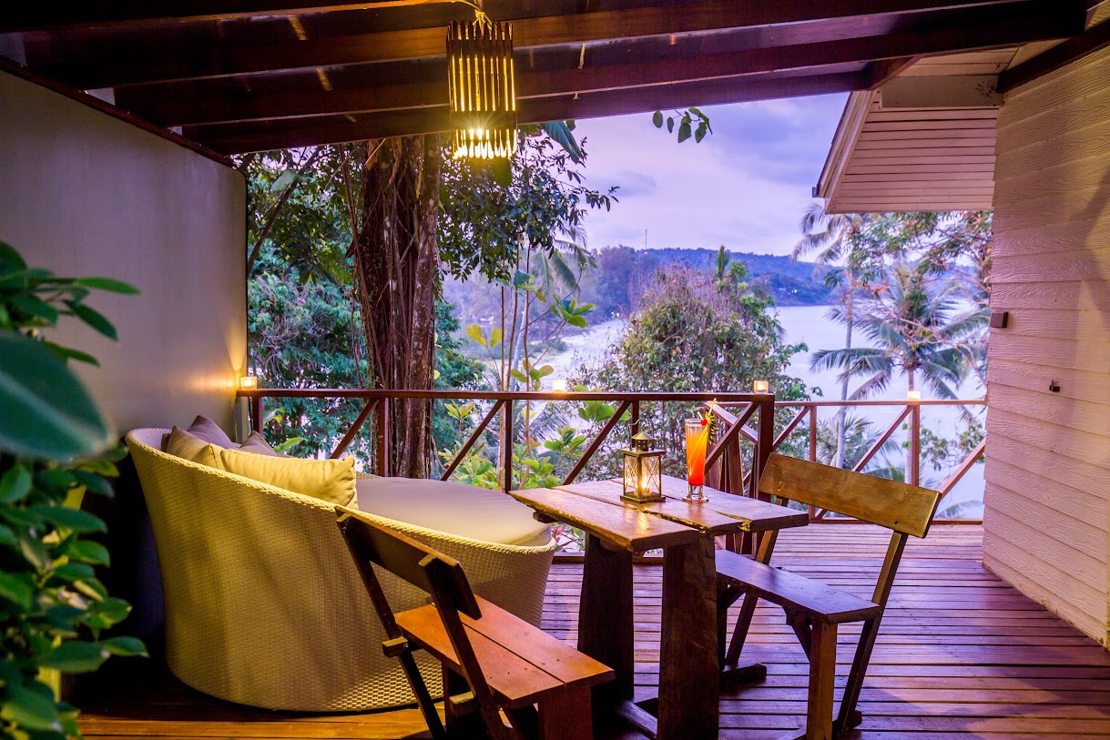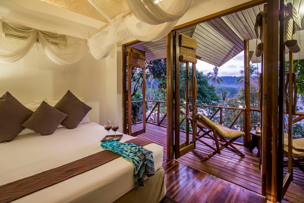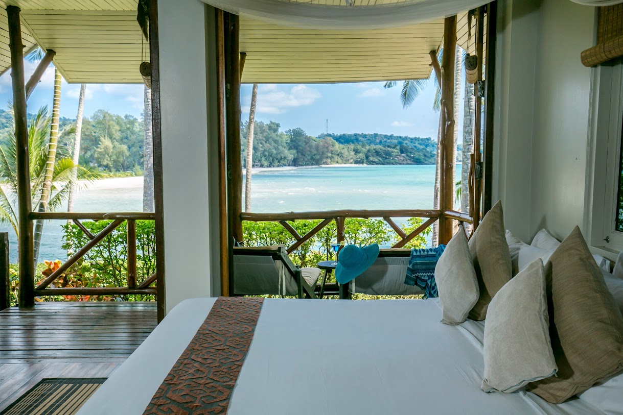 בונגלוס מאווררים עם נוף למפרץ באתר נופש נינוח המציע סעודות באוויר הפתוח, בריכה וספא.