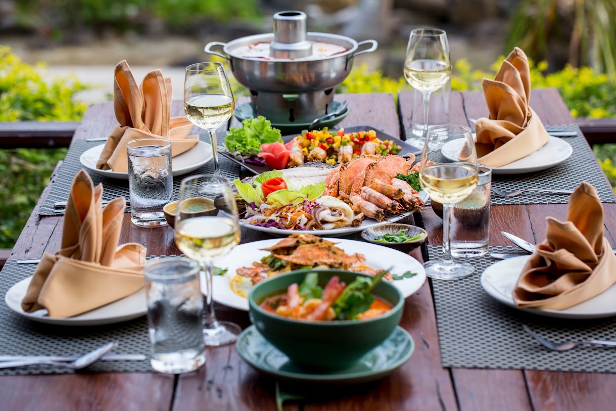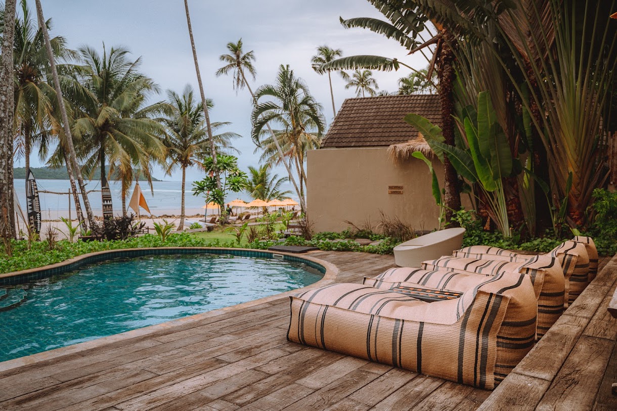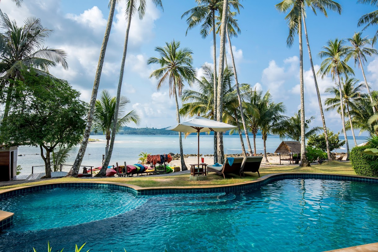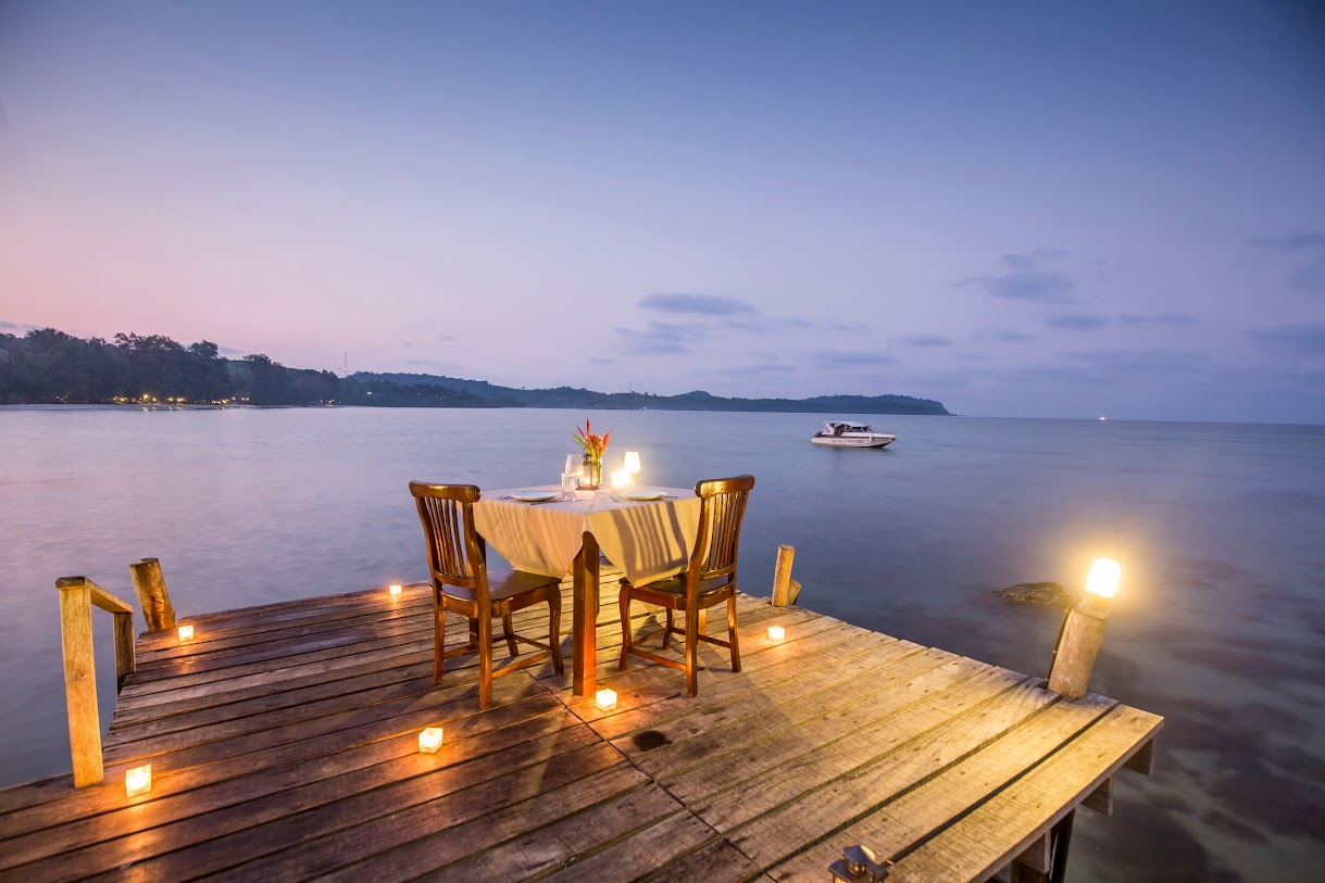 בונגלוס מאווררים עם נוף למפרץ באתר נופש נינוח המציע סעודות באוויר הפתוח, בריכה וספא.