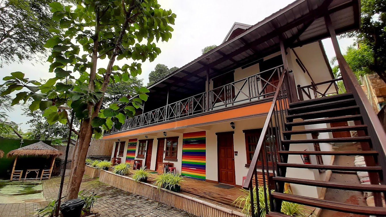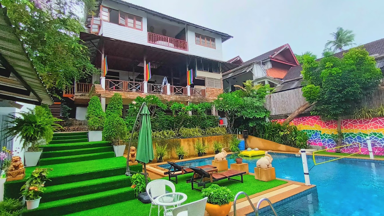 A restaurant, a bar & a clothing-optional outdoor pool in a relaxed resort for gay men only.